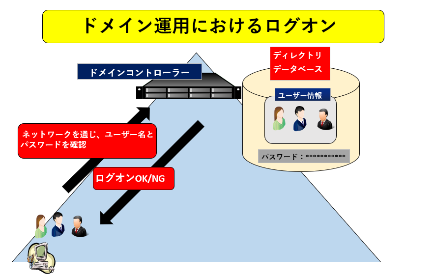 ドメインの運用におけるログオンは、ドメインコントローラーが管理するディレクトリデータベースを使用した認証。