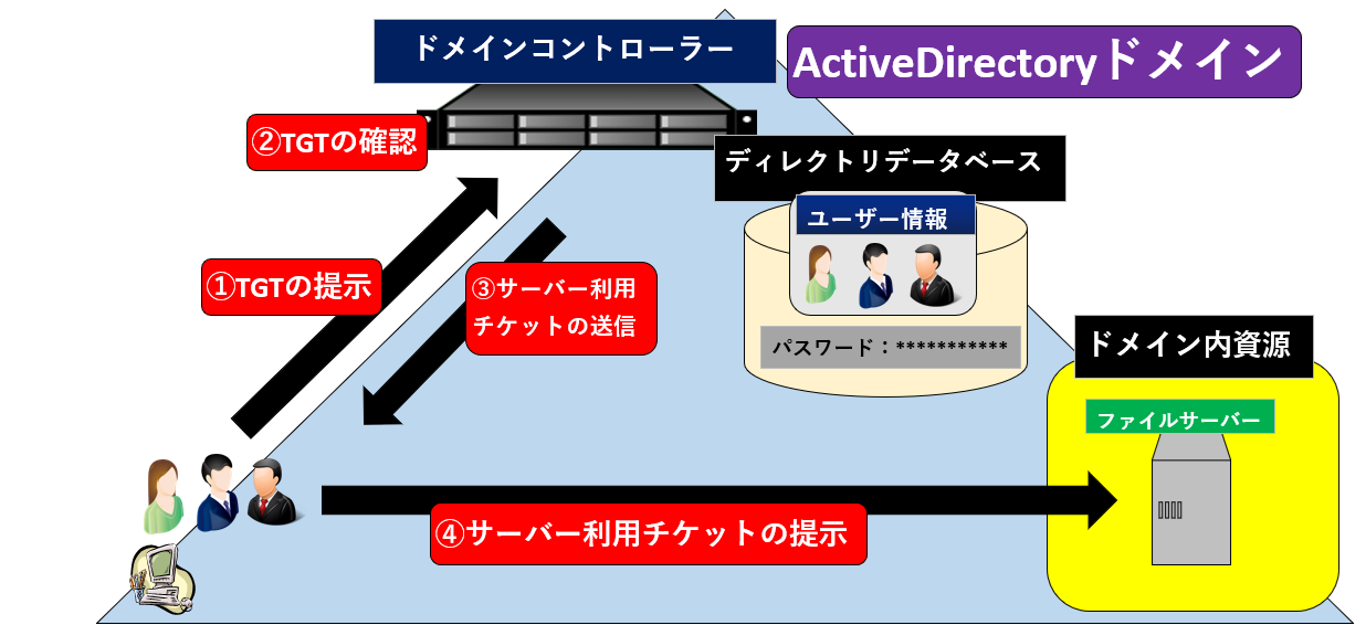 @ユーザーは、TGTを添付してファイルサーバーの利用許可をドメインコントローラ(KDC)に要求する。