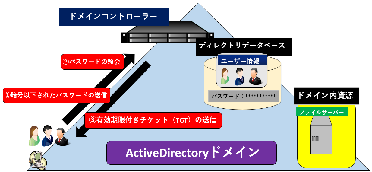 Aドメインコントローラー(KDC)は、送られてきたパスワードをActiveDirectoryデータベースに登録されたパスワードと照合する。