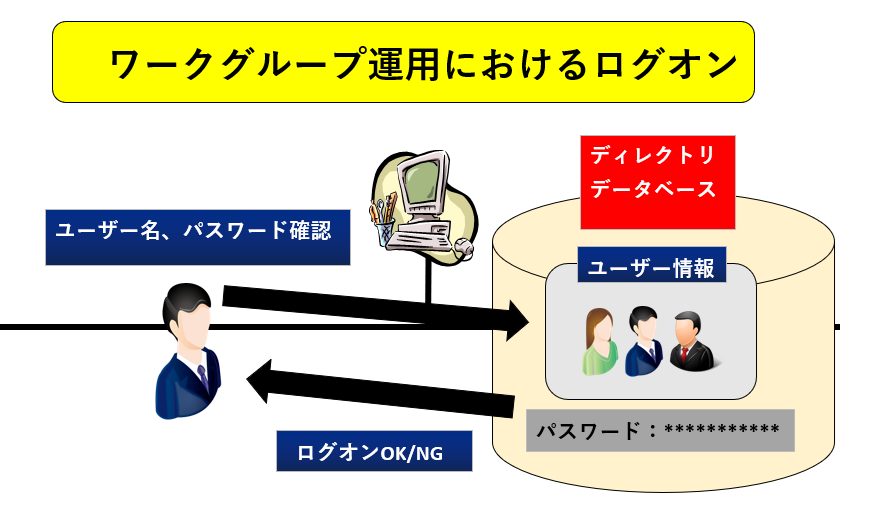 ワークグループ運用でのログオンは、各コンピューター管理するディレクトリデータベースを使用した認証。