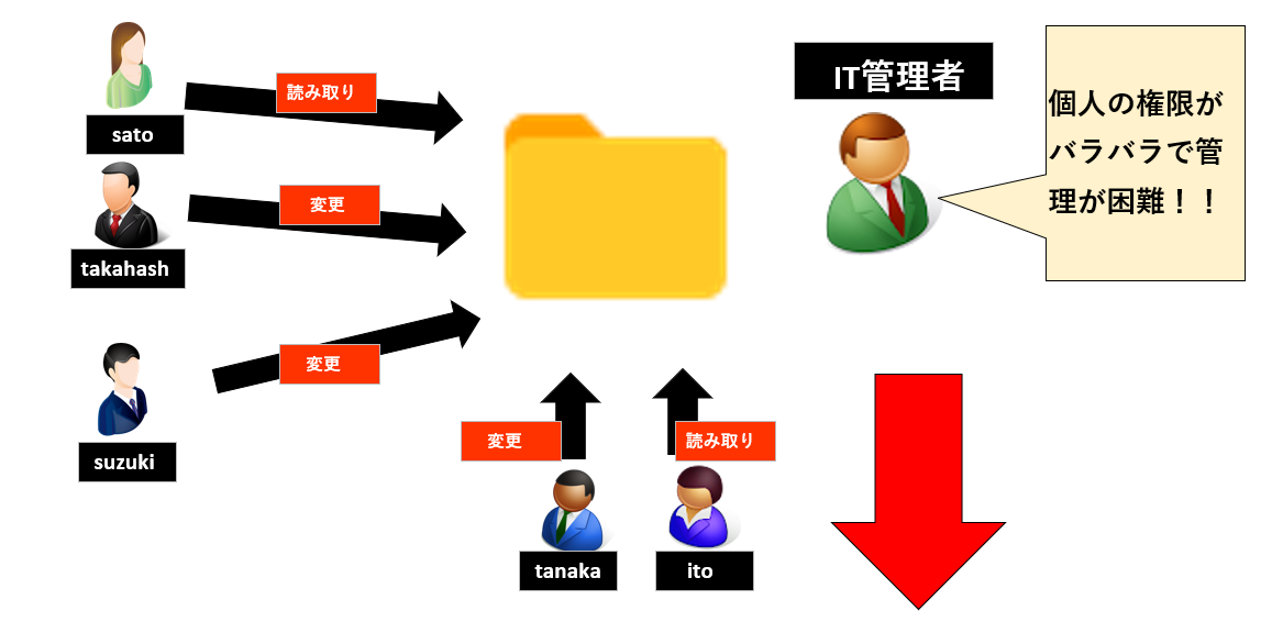 例えば、下図の様に各ユーザーにそれぞれアクセス許可を設定する場合、アクセス許可を設定する対象のユーザーが少数の場合は、大した作業にはならない。しかし、ユーザー数が増加すると、ユーザー数分の設定を行わなくてはならないため、管理作業が増大する。これは設定済みのアクセス許可を変更する場合も同様。