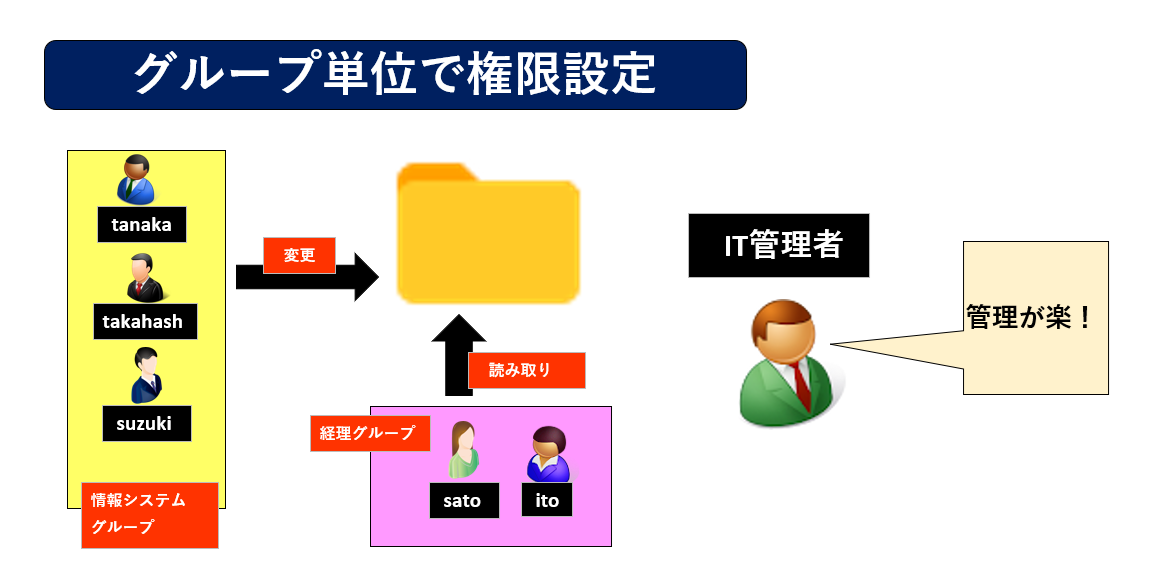 通常、管理者はユーザーが必要とするネットワークアクセスの程度と種類に基づいて、ユーザーをグループ化する。同じ業務レベルで働く社員の多くは、同じサーバー、フォルダ、ファイルにアクセスする必要がある事が多い。