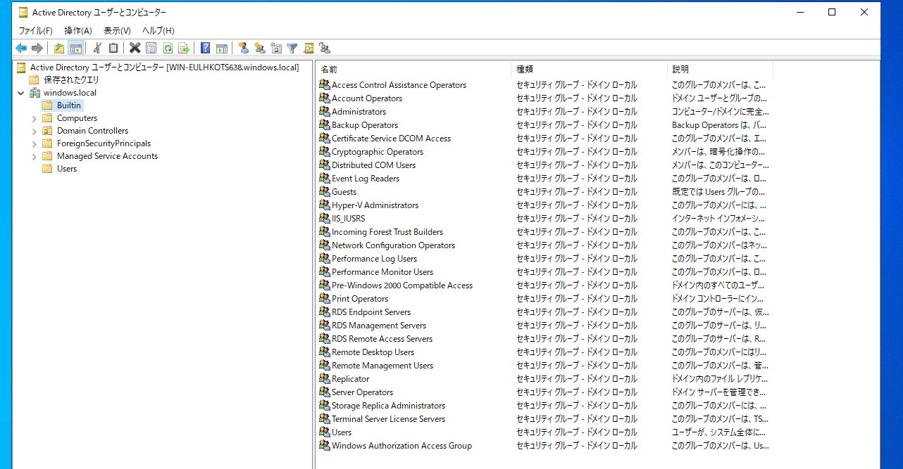 ビルトインローカルグループは、ActiveDirectoryのディレクトリデータベース上の「Builtinコンテナオブジェクト」に格納される。