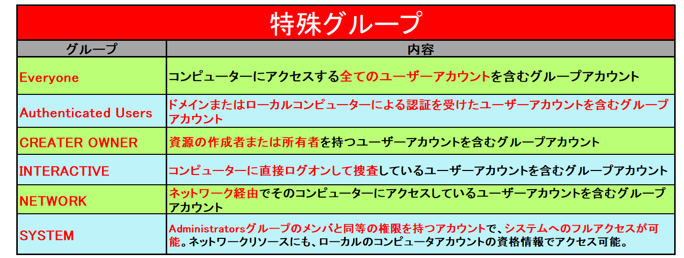 ビルトインユーザーアカウントと同様に、インストール時に自動的に作成されるグループアカウントがある。これを「ビルトイングループアカウント」という。