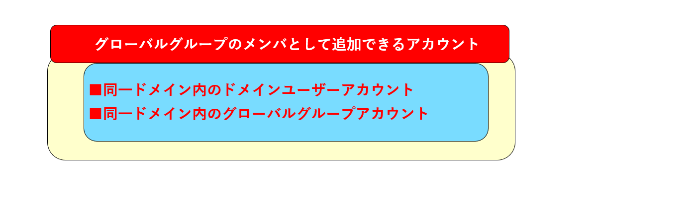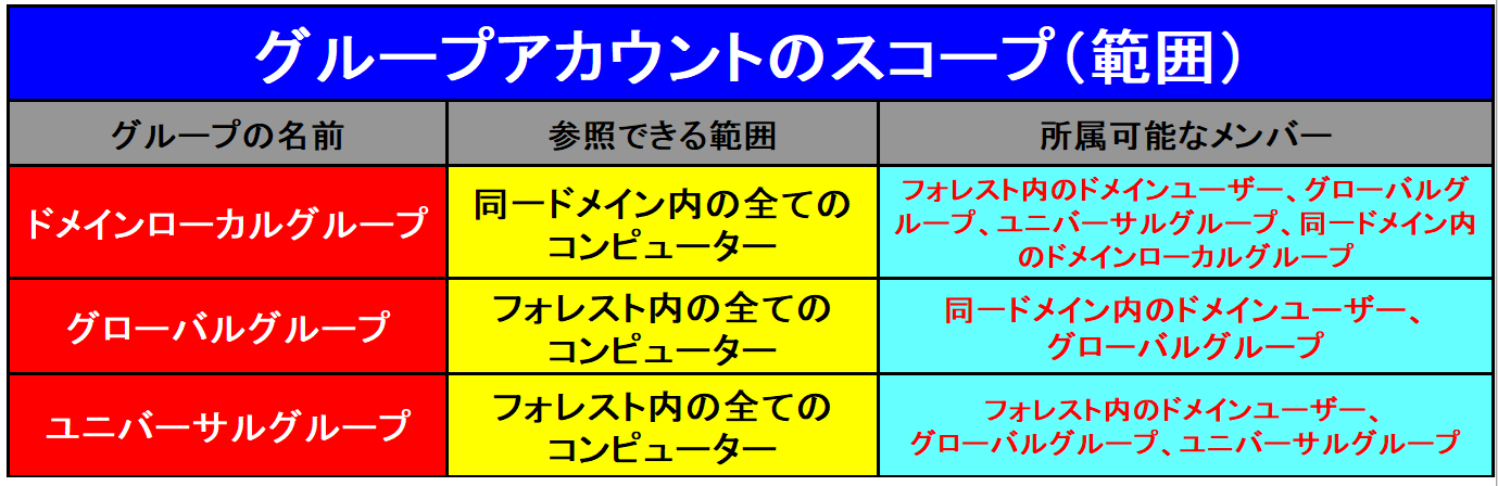 「グローバルグループ」とは、ドメインコントローラーのディレクトリデータベースに作成され、ドメインツリーやフォレスト内の全てのコンピューター上で利用できるグループアカウント。