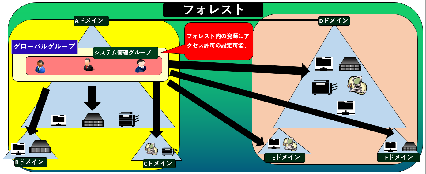 例えば下図の「Aドメイン」のドメインコントローラー上のグローバルグループ「システム管理グループ」は、フォレスト内の全ての資源に対するアクセス許可を設定出来る。