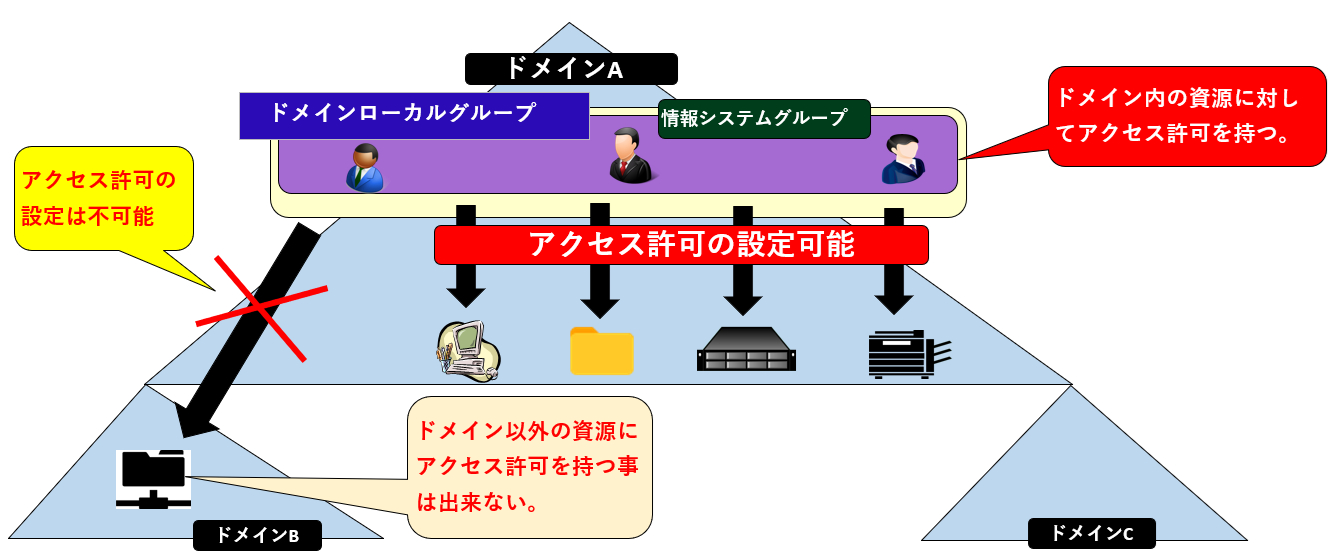 例えば、ドメインコントローラー上のドメインローカルグループの「joho-system」は、ドメイン内の全ての資源に対してアクセス許可の設定をすることが可能。しかし、この範囲はドメイン内に限られるため、フォレスト内にあるドメイン内の資源に対するアクセス許可を設定することはできない。