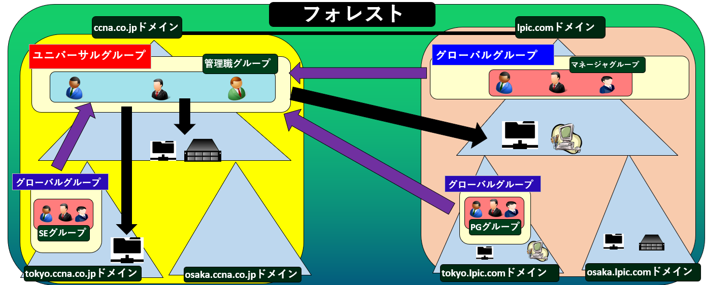 また、「lpic.comドメイン」 のグローバルグループ「マネージャーグループ」と「tokyo.ccna.co.jpドメイン」 のグローバルグループ「SEグループ」を、メンバーとして参加させることが出来る。