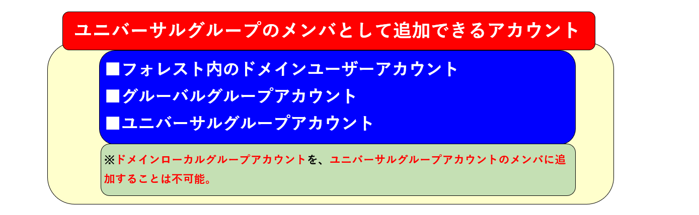 有効範囲はグローバルグループと同じだが、メンバーとしてフォレスト内の、他のドメインのグループアカウントやユーザーアカウントを参加させることが出来る。