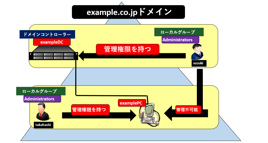 例として、下図の様にドメインコントローラーのビルトインローカルグループ「Administrators」は、ドメインコントローラーの管理権限を持つ。従って、Administratorsグループのメンバーである「Suzuki」さんは、ドメインコントローラーの管理権限を持つ。