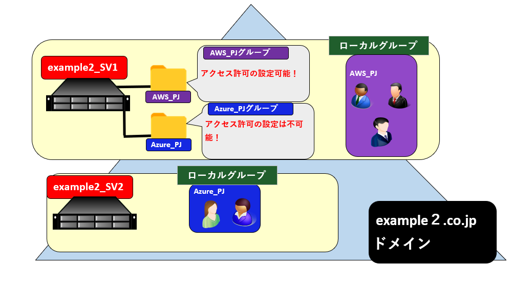 SERVER1のローカルグループ「AWS_PJ」には、SERVER1の資源に対するアクセス許可を設定することができるが、SERVER2のローカルグループ「Azure_PJ」には、SERVER1の資源に対するアクセス許可を設定することは出来ない。