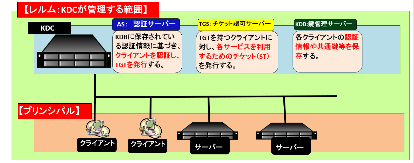 AS(認証サーバー)、TGS(チケット認可サーバー)、KDB(鍵管理サーバー)の3つのサーバーで構成される。